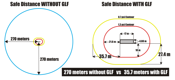 The GLF has been tested to exceed the safety standards for processing areas (loading bays), explosive storage and loaded gun storage. The first solution of its kind to be licensed by the ATF and N.R.Can for reduced Q.D (safe distance to the public)